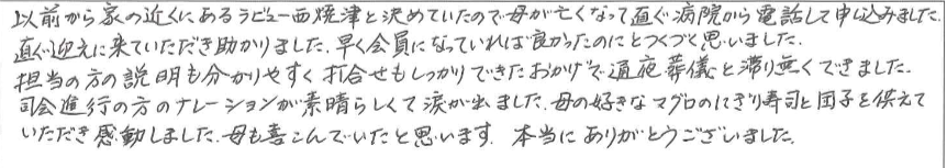 以前から家の近くにあるラビュー西焼津と決めていたので母が亡くなって直ぐ病院から電話して申し込みました。直ぐ迎えに来ていただき助かりました。早く会員になっていれば良かったのにとつくづく思いました。
